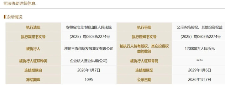 据国度企业信用信息公示系统解析,潍坊农创集团所合手潍坊经济区城投集团12亿元股权被公法冻结,冻结期限为2026年1月7日至2029年1月6日,执行法院为安徽省淮北市相山区东说念主民法院。而潍坊农创集团对潍坊经济区城投集团的合手股比例达60%。