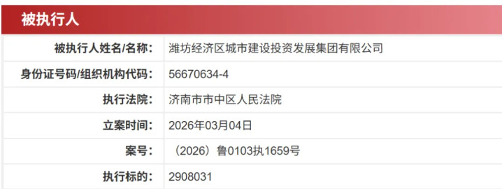 参加3月份,潍坊经济区城投集团又新增2条被执行东说念主信息。2026年3月11日,潍坊市寒亭区东说念主民法院将潍坊经济区城投集团列为被执行东说念主,被执行金额为55万元,案号为(2026)鲁0703执767号;2026年3月4日,济南市市中区东说念主民法院将潍坊经济区城投集团列为被执行东说念主,被执行金额约为290.80万元,案号为(2026)鲁0103执1659号。
