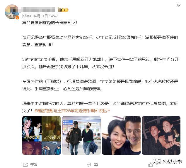 这手镯来头不小,是2000年他和王菲热恋时一王人定制的情侣款。两东说念主别离后,谢霆锋把它锁进保障柜整整十年,直到2014年复合才再行戴上,尔后十二年果然没摘下来过。