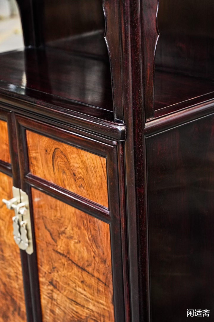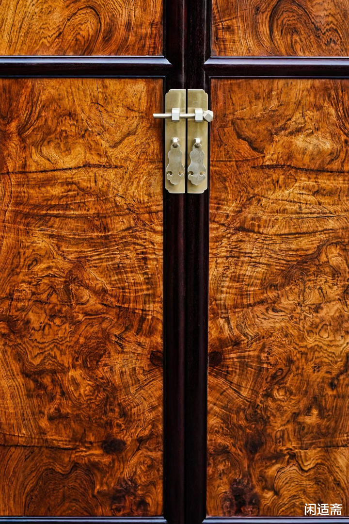 此柜通体甄选印度老料小叶紫檀,素有“木中君王”之称,百年寸檀、质量精细,色泽千里穆温润,纹理雅致如缎,自带皇家威仪与古朴气韵。而最为亮眼的面板,领受海南黄花梨一木对开独板打造,海黄被誉为“木中皇后”,自己即是稀缺珍材,一木对开更是难能难得,可遇而不成求。紫檀的千里穆放心与海黄的温润灵动井水不犯河水,一刚一柔、一庄一雅,既是对明式产品经典形制的传承,亦然材质与工艺的完满和会。